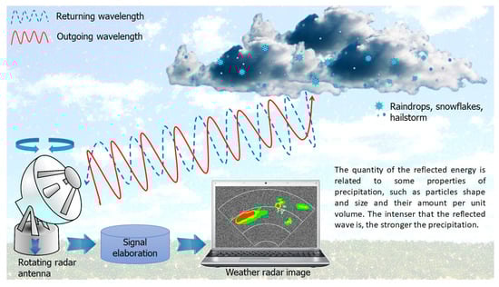 Weather radars send pulses of electromagnetic energy into the atmosphere, a microsecond of long microwave radiation to identify the presence of hydrometeors []. Hydrometeors from the Greek hýdōr-metéōros, which means literally “water that is high in the sky” represent all phenomena of condensation and precipitation of atmospheric humidity in liquid or solid particles. When the pulses strike an object such as rain, hail, or snow, Rayleigh scattering occurs and part of the energy is reflected back to the radar receiver (Figure 1) []. Rayleigh scattering takes place when the wavelengths are greater than the diameters of the hydrometeor particles. Different wavelengths identify particles of different sizes. Rayleigh scattering starts to become invalid when the hydrometeor diameters are large (e.g., 2–3 cm) compared to the wavelength of the X-band. The X-band has the shortest wavelength compared to the S and C bands.
