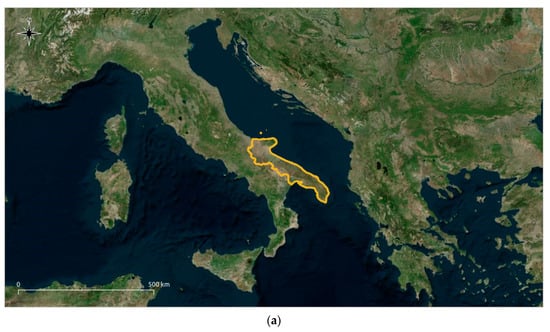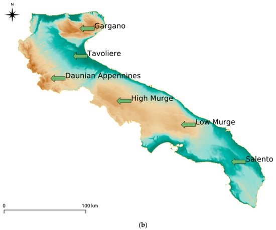 (a) Administrative limits of the Puglia region (Base map from Bing Maps). (b) Geographical subdivisions based on the morphology of the territory of the Puglia region (Base map from SIT Puglia []).