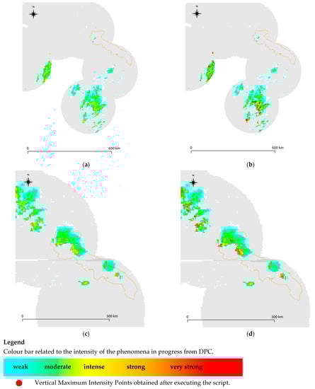 Example of two tests carried out: (a) and (c) are data from DPC servers, respectively, on 4 July 2020 and at 21:00 and 14 October 2021 at 17:00, (b) and (d) are the same data with the point obtained after running the script and imported into a GIS system.