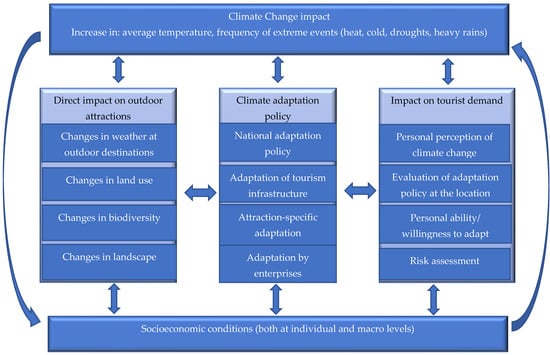 Links between climate change, adaptation, and tourist demand for outdoor attractions. Authors’ adaptation based on Pröbstl-Haider et al. [6].