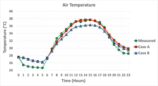 Measured (green graph with circular indicator) and calculated air temperature by the model for Case A (red graph with square indicator) and B (blue graph with triangular indicator) at 2 m height in correspondence with the centre of the park.