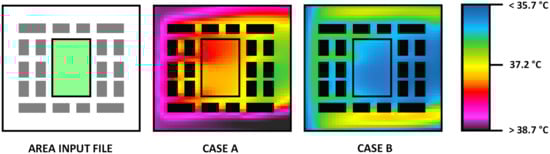 This is an important aspect considering that even small changes (lower than 1 °C) can reduce health risks and save energy by reducing consumption. Figure 2 shows the temperature distribution of the study area at 2 m height at 13.00. Case A showed a cooler area in correspondence with the park, and the configuration of buildings generated hotter zones according to the modelled wind direction (S/W). Case B confirmed the pattern of temperature distribution of Case A and showed a diffused cooling for the whole area.