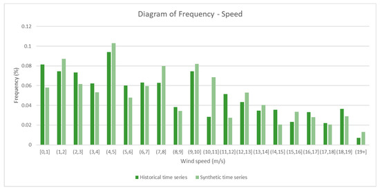 In order to understand the maintenance of the hourly variation and the seasonality of the wind, the frequencies–speeds of the historical and the produced time series of the wind are compared. As shown in Figure 3, there is a similarity between the two and, therefore, the reliability of the model is verified. The graph corresponds to the geographical location that the historical time series data were collected. Even though there are some discrepancies, overall, the synthetic time series can be approved.