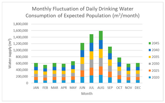 For the estimation of the water needs of Lemnos, it is necessary to evaluate the water consumption per type of inhabitant. In particular, the average daily consumption is equal to 170 l/d/capita for permanent residents, 225 l/d/capita for vacationers, and 170 l/d/capita for tourists [26]. However, due to increased water demands during summertime and in September, an additional 20% of water consumption is taken under consideration for the total population. Once the population projection for the year (target 2045) is available, which is based on the assumption of geometric progression, the water needs can then be calculated. Figure 4 shows the monthly water supply change every 5 years. The results are considered reasonable, because the demand during the summer is increased, and in total, as the years go by, the water needs rise due to population growth.