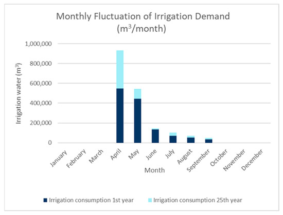 Irrigation is also necessary for the crops and livestock of the island. To estimate the irrigation needs of crops, the Blaney–Criddle method is used [27]. The population growth does not have an impact as before. Blaney–Criddle developed an empirical equation that accounts for evaporation, the average air temperature, and the percentage of daylight hours. In Figure 5, the irrigation consumption of the crops for the 1st and the 25th years of the HRES are presented.
