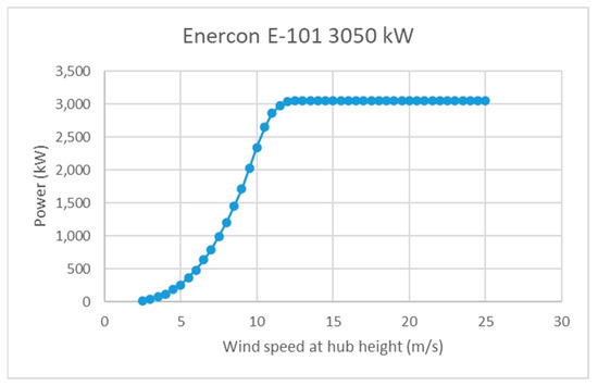As already indicated, Lemnos has three wind turbines, Enercon E-44, installed with 900 kW of rated power each, in the southeastern part of the island. Nevertheless, the construction of a new wind farm is considered essential as a consequence of the increased water and energy demands. The location of the wind farm is purported to be in the northwestern part of the island, as shown in Figure 6. This is due to the Natura 2000 protected areas located on the east side of Lemnos, with the favorable winds occurring on the north side. The average turbine—with a capacity of 2.5–3 MW—can produce more than 6 million kWh in a year—enough to supply 1500 average EU households with electricity [28]. In 2020, there was a sharp increase for turbines installed in the 2.75–3.5 MW range. More wind energy per turbine means that fewer turbines are needed to generate a desired capacity across a wind plant—ultimately leading to lower costs [29]. The types of wind turbines considered are the Enercon E-101 of 3050 kW, Vestas V112 of 3000 kW, and Siemens SWT-101 of 3000 kW. The nominal curves between the three possible turbines are quite similar [30,31,32]. However, Enercon E-101 3050 kW has the ability to make the most out of wind speed lower than 10 m/s. Table 2 contains the expected power produced by each wind turbine. In Figure 7, the power curve of Enercon E-101 of 3050 kW of rated power is presented.
