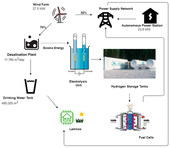 The HRES under study examines a hybrid system—a wind power plant and a desalination plant, with two possible energy storage systems, i.e., by the method of pump storage or by use of hydrogen produced through electrolysis [36,37,38,39]. Therefore, two operating scenarios are simulated and examined. The purpose of both storage methods is to cover as much as possible of the water supply, irrigation, and energy needs. During the simulation of both scenarios, 30% of the wind energy produced is driven directly to the grid, while the rest, 70%, is provided to the HRES. Moreover, in case of inability to meet the energy needs, the APS supplies electricity to the island. The lifespan of the project is 25 years.