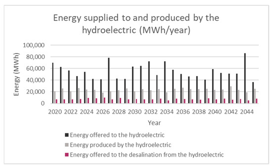 However, the scenarios differ significantly in meeting energy needs. The first one, which is with the hydroelectric plant, has reliability equal to 91%. The desalination plant channels the excess energy to the pumped hydro station. When the need of electricity arises, water is channeled through the turbines and potential energy is converted to electricity. Figure 10 presents the energy that is offered to and produced by the hydroelectric project. The annual energy production varies. For example, the year 2026 is not as productive—wind energy wise—as is year 2027, according to the synthetic time series that was created. However, the generated energy of the hydroelectric, which is channeled to the grid, appears to be, every year, approximately 20,000 MWh for the lifespan of the HRES. Moreover, the pumped hydro station produces energy only when it is needed. In addition, the hydroelectric covers the energy needs of the desalination plant for the production of drinking water.