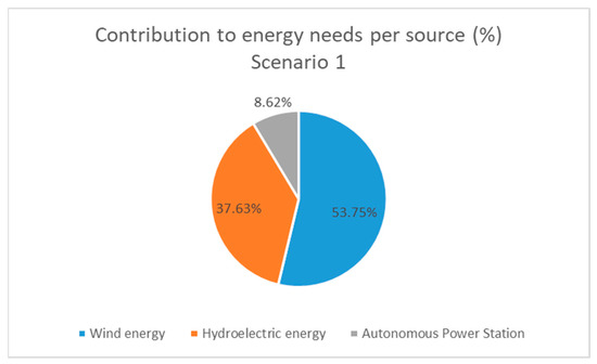 The HRES of the first scenario can cover 91% of the energy needs of Lemnos. As shown in Figure 11, from that, 53.75% is from wind energy and the rest, 37.63%, is from the energy of the hydroelectric plant. As for the 8.62% that is not covered by the current HRES, the APS offers the energy needed. The APS remains in operation at 15% of its capacity, despite the existence of the HRES.