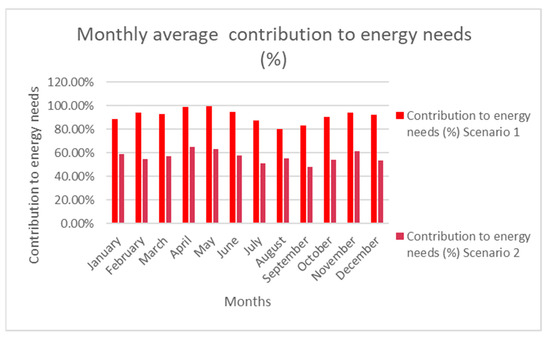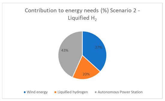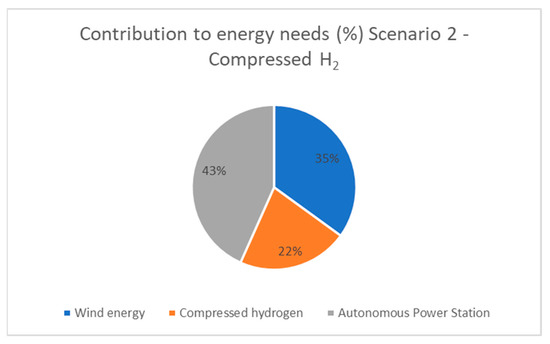 The second scenario, the one that contains hydrogen storage, has reliability of covering energy needs equal to 57%. This percentage stays fixed, using either compressed gas hydrogen or liquefied hydrogen. The energy that is offered, first in the electrolysis and then in the respective storage tank, is actually the wind energy that is not used from the desalination plant. The electrolysis unit produces hydrogen gas, which can then be stored at very high pressures (compressed) or at very low temperatures (liquefied). Nevertheless, if compressed hydrogen is selected, then wind energy meets 35% of the energy needs and the remaining 22% is covered by the conversion of compressed hydrogen to electricity through fuel cells. If the use of liquefied hydrogen is chosen, then 37% of the needs are met by wind energy and 20% by the conversion of liquefied hydrogen to electricity through fuel cells. In both cases, the APS-operating at part of its capacity covers 43% of the needs. The percentages of each choice are shown in Figure 12 and Figure 13. Figure 14 shows the monthly fluctuation of contributions to energy needs per scenario. Figure 15 shows the energy offered in electrolysis and the subsequent storage of hydrogen, as well as the energy produced by each form of hydrogen. The difference observed in energy production between compressed and liquefied hydrogen, even though narrow, is attributed to the energy consumed for the transformation (liquification) of the latter.