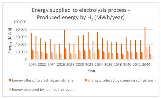 Hydrogen is a way to store and transport energy. Hydrogen produced by electrolysis is in a gaseous form. It is also an extremely light gas, which occupies a significant volume under atmospheric conditions. Its density is 0.09 kg/m3. For efficient storage and transport of hydrogen, this volume must be reduced [33]. The storage tanks considered in this study include hydrogen in compressed gaseous form and hydrogen in liquid form. The first case of hydrogen requires, for its compression, 4.05 kWh per kg of H2 produced. Pragmatically, the temperature at which the gas is located remains constant and the pressure increases. At a value of 700 bar, which means 700 times the atmospheric pressure, hydrogen has a density of 42 kg/m3. Under these conditions, about 5 kg of H2 can be stored in a 125-litter tank. In the second case of hydrogen, its liquefaction requires 12 kWh per kg of H2 produced. Hydrogen is converted from a gaseous form to a liquid form at a temperature below −253 °C (critical temperature). At this temperature and at atmospheric pressure, the density of the liquid hydrogen is approximately 71 kg/m3. That means, 5 kg of liquid H2 (LH2) can be stored in a 75-liter tank [34]. Therefore, for the production of hydrogen, the energy needs of the electrolysis system are taken into account, as well as the energy needs for the respective case of hydrogen storage. Under normal conditions of temperature and pressure, 1 kg of H2 will occupy 12.15 m3 possessing an energy content of 33.5 kWh [35].