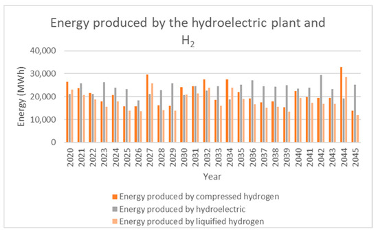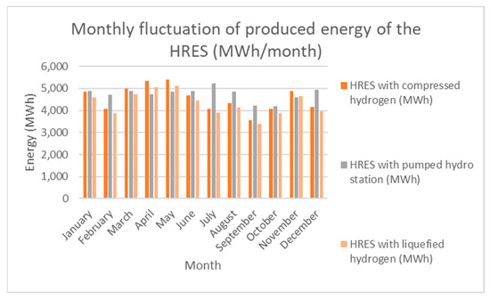 From a technical perspective, the choice of solution depends on the required energy to fulfill the energy and water supply needs. The energy offered in both cases of wind energy storage is the same. However, the two systems do not deliver the same energy. The hydroelectric plant has an efficiency of 80%, while with the use of a fuel cell, the efficiency is just 60%. Judging by Figure 16, which presents the comparison of the produced energy, it can be seen that the hydroelectric plant does not always exceed the production of energy using hydrogen. In the years when there is a high amount of excess energy, i.e., 2027 and 2044, operating scenario 2 responds better than scenario 1, despite the form of hydrogen used. On the contrary, in cases of low energy surplus, such as years 2039 and 2045, the hydroelectric plant generates significantly more electricity than using hydrogen. The production of energy through the hydroelectric seems to be relatively stable, while through the fuel cells, more fluctuations are observed. The process of hydrogen production and its subsequent conversion requires a significant amount of electricity. When that amount exists and it is greater than 60,000 MWh, then there is a high generation of electricity due to the use of hydrogen. When the excess energy is approximately equal to 60,000 MWh, the differences in electricity production are small, while in cases where there is less than the aforementioned energy available, the electricity generation of the hydroelectric plant is higher. The monthly fluctuation of produced energy of the HRES is shown in Figure 17.