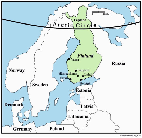 The relevance of the case country may be considered to be well justified, because many international comparisons on water and environmental management rate Finland among the top countries. These include, i.e., the Water Poverty Index [21], and the Environmental Performance Index [22], as well as those in other sectors such as education [23], the Corruption Perceptions Index [24], and those on wider social development: SDG Achievement [25], Sustainable Society Index [26], Social Progress Index [27], and even Country Happiness [28]. Furthermore, Finland was, in many respects, a European hinterland until the late 1940s, but has since developed at a fast pace. In international comparisons, together with the above-mentioned rankings, this makes it interesting to explore the reasons behind this development more deeply. Figure 1 presents an orientation on the location of Finland, its cities mentioned in the text, and its neighbouring countries: Estonia, Norway, Russia and Sweden.
