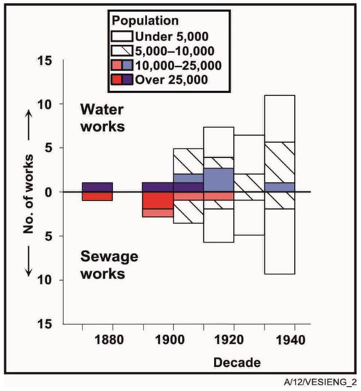 Between 1910 and 1961, approximately 20 wastewater treatment plants were constructed on this voluntary basis, driven by the acute need to promote water pollution control. WWII stopped the planned construction of wastewater treatment facilities until the 1950s [92] (p. 71).