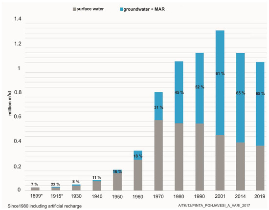 Changes in relative shares of surface and groundwater use of the total pumped volume by water utilities in Finland, 1899–2019 ([29] p. 63, modified).