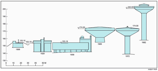 Finland, Sweden, and France, among others, have a strong tradition of using concrete water towers (elevated reservoirs) made by slip-form casting. Especially with power cuts and pipe bursts, the storage capacity of water towers has proved important, and by modern pumping their use can be optimized. Figure 4 shows the historical development of water towers in Tampere. Their volume has increased, pressure levels have risen in the suburbs, and designs towards mushroom-type towers have appeared. The oldest elevated water reservoir from 1898 is still in use in Tampere [80,81,82].
