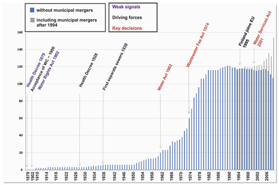 Figure 5 summarizes the diffusion of urban wastewater treatment in Finland from 1879 to 2009, elaborated by major acts and decrees. The Health Decree of 1879 and the Water Rights Act of 1902 were the first weak signals of emerging water pollution control. The major driving forces for pollution control covered the acceptance of flush toilets around 1900, the Health Decree of 1928, the construction of the first separate sewers in 1938, and EU membership in 1995. The following three acts were very important strategic decisions, because they included concrete requirements: Water Act of 1962 (wastewater treatment), Wastewater Fee Act 1974 (finance), and the Water Services Act of 2001 (upgrading treatment). Furthermore, the Water and Wastewater Utilities Act of 1977 promoted the integration of water and wastewater utilities, which has proved to be feasible in most cases [93].