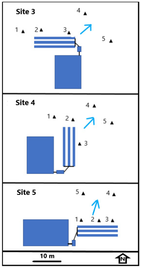 | Site | Tank Capacity (L) | System Type, Trench Media | Drainfield Trenches Number, Length (m) | System Age Start of Study | Avg. Water Usage (L day−1) |
