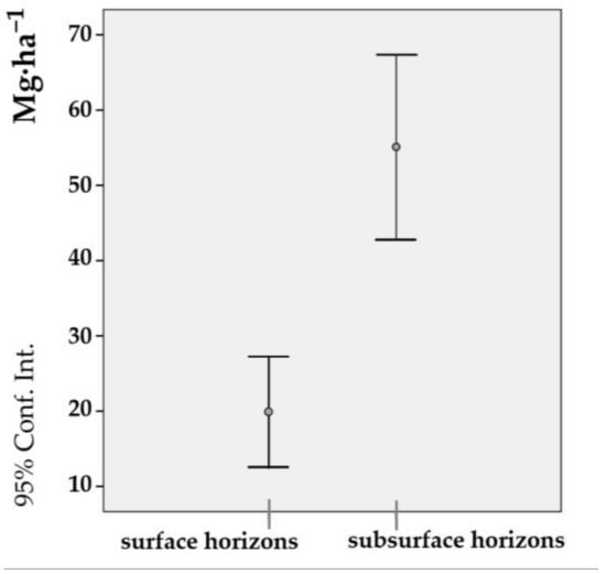 Statistical analysis of the differences in the values of SOC stock in the superficial and subsurface horizons (95% confidence intervals). Software: IBM SPSS Statistics v.24.