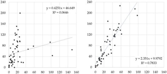 The heterogeneity of the vertical distribution of partial stocks (referring to each horizon of the profile) is revealed by the high value of the standard deviation. This makes it difficult to apply predictive criteria to estimate the total SOC stocks. In this regard, the predictive capacity of surface horizons (“A horizons” in the soil profile descriptions) with respect to the soil profile is practically null for a linear model (R2 = 0.06) (Figure 2a). However, the predictive ability markedly increases (R2 = 0.78) in the tentative case of sampling to a depth of 30 cm from the surface (Figure 2b) (mean 27.7 ± 21.9 Mg ha−1), which typically comprises two or more complete A or B (or even C) genetic horizons. However, it should be considered that such an approximation covers an amount somewhat above 40% of the total soil C stock; the stock at 30 cm should not be used as direct data, but as a predictor, being of interest to improve the information on which such predictive ability is based.
