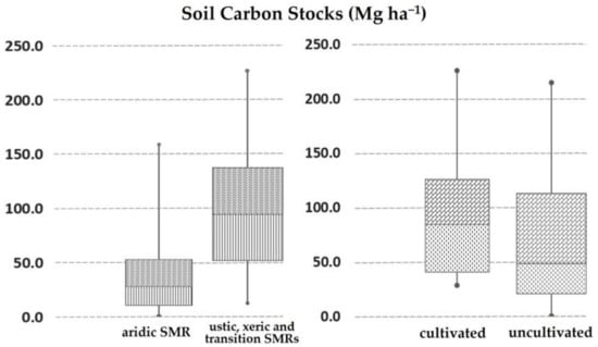 Soil C stocks (Mg ha−1) in studied soil profiles considering: Soil Taxonomy’s moisture regimes (left); basic land use: agricultural vs. natural or semi-natural vegetation (right).