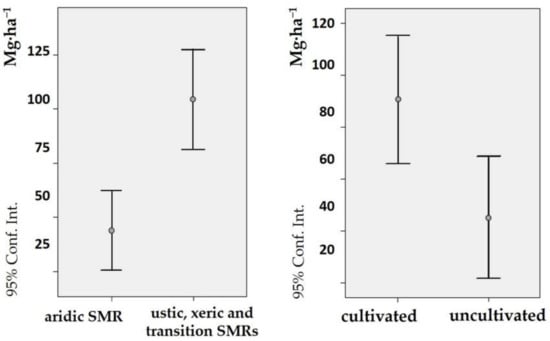 Statistical analysis of the differences in the values of SOC stock considering soil moisture regimes (left) and basic land use (95% confidence intervals). Software: IBM SPSS Statistics v.24.