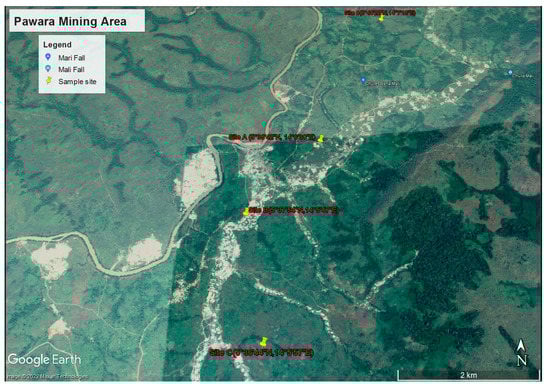 Site 0 (control site) is the reference test site. It is located far from the area where mining activities operate. The samples consist of undisturbed soil that has never been influenced by gold activities and is far from human activities in the Pawara area. It is located about 1.5 km from the gold mining sites and 10 km from the village center.