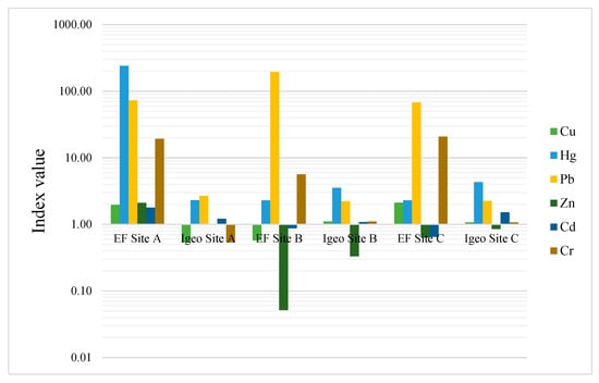 The EF for the metals was calculated using Al due to its relatively low variability. The metals show values above the natural background of 1.5 in all sites except for Cu, Zn and Cd. EF values at Site A are high for Hg, Pb and Cr. Sites B and C display low EF values for Hg relative to Site A. Pb is distinctively higher at Site B (Table 4). Comparing the Ef and Igeo values, the study area shows very low Igeo in Zn and a corresponding low EF. Site A shows very low Igeo except for Hg and Pb but with moderate to high EF (Figure 4). Pb stands out with the highest EF in all three sites. EF of Cr is high at all sites but with very low Igeo similar to Cd.