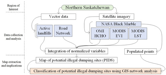 The United States’ National Aeronautics and Space Administration (NASA) nighttime light (NTL) satellite imagery, formaldehyde Total Column (HCHO) retrieved from the Aura Ozone Monitoring Instrument (OMI), Enhanced Vegetation Index (EVI), and Land Surface Temperature (LST) collected from MODerate resolution Imaging Spectroradiometer (MODIS) are commonly adopted in environmental studies and are adopted in this study. Discussion on the use of these remote sensing indices is provided in Section 2. The objectives of the current study are to (i) develop an original analytical approach to map PIDS using a new set of remote sensing indices (e.g., NASA NTL, OMI HCHO, MODIS EVI, and MODIS LST) and vector files (e.g., location of active landfills and road network) and (ii) prioritize PIDS in the study area considering neighboring populated points and GIS Network Analysis.
