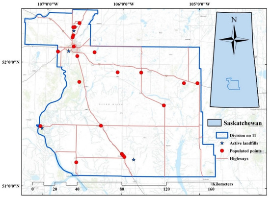Unauthorized dumping activities were frequently reported in northern and central Saskatchewan and Alberta [32,33]. Therefore, Division 11 in central Saskatchewan is selected, as shown in Figure 2. Division 11 has a population over 326,000, and there are four active landfills. The City of Saskatoon, the most populated city in the province with over 266,000 people (or approximately 23% of the province’s population), is located near the northwestern corner of the division. Further details about the study area are shown in Table 1.
