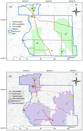 PIDS 2, with a size of over one fifth of the study area (3575.0 km2), is located along the eastern edge of the study area, as shown in Figure 3a. A larger AC 2 of 2482.6 km2 and the absence of an active landfill (Figure 3b) might encourage illegal dumping activities. Unlike other divisions in Saskatchewan, significantly more transfer stations are used in this division. Ghosh and Ng [73] examined the waste management system in Saskatchewan and reported that Division 11 had the smallest landfill to transfer station ratio of 0.4 in 2017. However, the road density of PIDS 2 (0.098 km/km2, Table 4) is also the lowest. Therefore, accessibility of the major populated points is only moderate. It appears that the distribution of major populated points in Division 11 is not properly reflected in the design of the road network. Richter et al. [74] also reported that the distribution of waste management facilities and populated points are not well-aligned with the divisional boundaries in Saskatchewan and recommended a new tessellation-based regional waste management system.