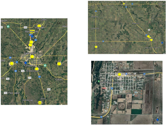 PIDS 1, located near the northwestern corner of Division 11 (Figure 3a), is the closest to the City of Saskatoon. PIDS 1 has the highest road density in the study area (0.25 km/km2, Table 4). As such, the area coverage of the major populated points is also the largest (AC = 9, Table 4). The majority of these major populated points are distributed along a southern–northern highway (Figure 3a and Figure 4a), probably due to urban sprawl. Sizo et al. [71] showed that the lack of detailed zoning plan for urban development near Saskatoon has stressed the conservation efforts of wetlands. Likewise, Habibi and Asadi [72] indicated that the urban sprawl might be due to absence of long-term land use management, extensive use of strip development of small industrial and residential communities, and leap-frog development along the roads and major highways. However, the presence of two active landfills in AC 1 (Figure 3b) along with a shorter average travel time from the major populated points to adjacent landfills (26.1 min, Table 4) might mitigate potential illegal dumping activities.