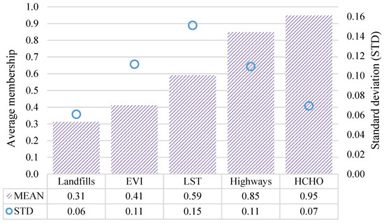 Higher average membership grades (>0.5) are observed for LST and highways. The factors are also spatially sensitive, with STDs of 0.15 and 0.11 for LST and highways, respectively. The results suggest that both parameters are good indicators in mapping PIDS in Division 11. It has been widely reported that LST can be used as a proxy to identify landfills and illegal disposal sites [3,78,79]. In addition, the majority of illegal dumping activities were reported either in the vicinity of the road network or in places with greater accessibility [1,80,81]. Both factors are recommended for studies on the identification of PIDS.