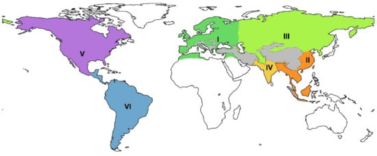 - Holt, B.G.; Lessard, J.P.; Borregaard, M.K.; Fritz, S.A.; Araújo, M.B.; Dimitrov, D.; Fabre, P.H.; Graham, C.H.; Graves, G.R.; Jønsson, K.A.; et al. An update of Wallace’s zoogeographic regions of the world. Science 2013, 339, 74–78. [Google Scholar] [CrossRef]