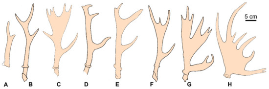 Diversity of antlers of the late Miocene representatives of the subfamily Capreolinae: (A), Lucentia iberica [31]; (B), Procapreolus ucrainicus [22]; (C), Neomegaloceros gracilis [18]; (D), Pliocervus matheroni [18]; (E), Pavlodaria orlovi [32]; (F), Damacerus bessarabiae [18]; (G), Metadicrocerus variabilis [22]; (H), Cervodama pontoborealis [35].