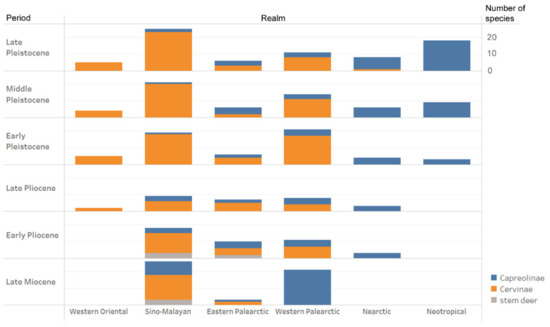 Biogeographic and geochronological distribution of fossil crown Cervidae in the world. The bar height corresponds to a number of species.