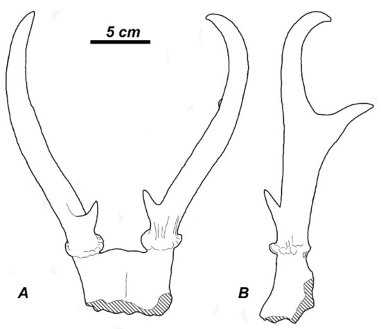 Thus, the antler of Cervavitus demissus No. 12.705 [21] (Figure 18A) resembles Zdansky’s Eostyloceros [46]. The second antler ascribed to C. demissus (No. 22.957 [21]) is different and may belong to Capreolinae as it is characterised by a very high position of the first ramification.