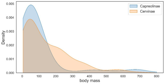 The distribution of body size within the cervid subfamilies Cervinae and Capreolinae.