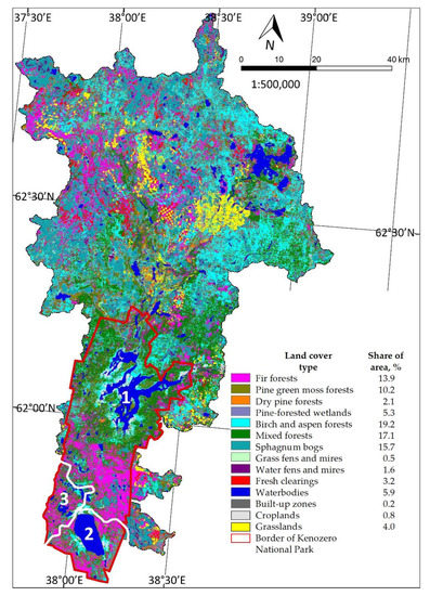 Study area: land-cover types and their area share in 2021; 1—the catchment of Lake Kenozero; 2—the catchment of Lake Lache; 3—the catchment of Baltic Sea.