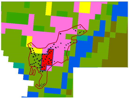 Figure 2. Distribution of buildings within the settlement of Pershlakhta superimposed on the used land-cover map (the red pixels show the built-up land-cover class, red line shows administrative boundary of the settlement, black rectangles show buildings).