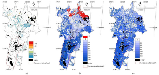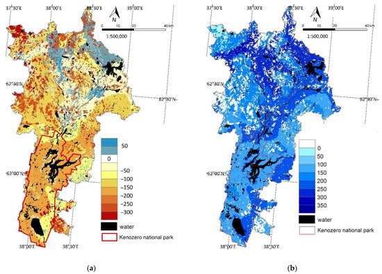 Our estimates show that the runoff from the study area varied from 159 mm/year in 2007 to 164 mm/year in 2021 (Table 1, Figure 3a), i.e., 26–27% of precipitation (605 mm/year). Vegetation reduced the runoff from the study area by 125 mm/year (Table 1, Figure 3b).
