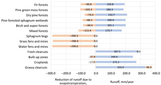 Swamps reduced runoff the most (287–290 mm/year), as there was no runoff from them, and evapotranspiration was high (Figure 3b and Figure 4). Forests reduced runoff moderately (74–115 mm/year). Fir and mixed forests in the southern part of the territory, mainly within the boundaries of the national park, made the main contribution (100 mm/year). Deciduous and pine forests in the northern part of the territory reduced runoff to a lesser extent (Figure 3b). Croplands, fresh clearcuts, and built-up areas almost did not regulate the runoff. Grassy clearcuts even increased it a little (Figure 4). This can be explained by the fact that they were located mainly in the north of the study area (Figure 3b) in vast areas on podzolic soils with a large proportion of sand. The water-holding capacity of these soils was less than that in areas of fresh clearings and croplands located in other parts of the study area. In the north of the study area, there were areas of birch and aspen forests, which also slightly (by 5 mm/year) increased runoff (Figure 3b). These areas were located on illuvial–ferruginous podzols with a small root depth. If these forests are cut down, waterlogging can occur, and fens can form in their place.