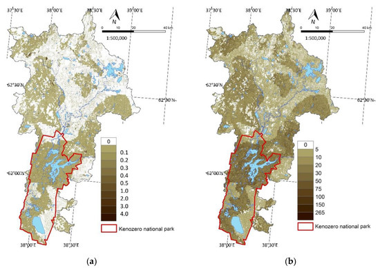 In the hypothetical case of immediate total forest loss, erosion increased by 2.4 t/ha/year immediately after clearing (Table 1), i.e., more than 30-fold. The maximum increase occurred in the territory of Kenozero National Park (up to 12 t/ha/year on average) and on hilly areas (from 20 to 70 t/ha/year) (Figure 8b). Erosion significantly increased in areas with soddy–podzolic soils in the northern part of the study area (2–5 t/ha/year). On podzol soils, there were no significant increase in erosion (up to 0.5 t/ha/year). After 3 years, as clearcuts were overgrown with grass, the anti-erosion functions of vegetation were almost recovered, and erosion exceeded the initial value by only 0.01 t/ha/year (Table 1). However, an excess of erosion by 0.2–0.3 t/ha/year remained in the national park, as well as on the slopes around Lake Kenozero (up to 0.5 t/ha/year) (Figure 8c). In the northern part of the study area, in areas on soddy–podzolic soils with a heavy mechanical composition, the excess erosion was severalfold lower (from 0.01 to 0.10 t/ha/year).