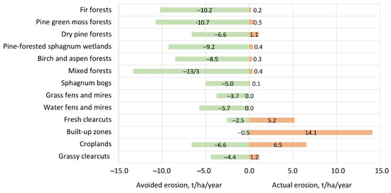 The study area was characterized by a relatively low actual erosion (0.05–0.08 t/ha/year) (Table 1). The map of actual erosion in 2007 shows that, in areas of podzol soils, erosion did not exceed 0.02 t/ha/year (indicated in white in Figure 6a). The southern part of the study area (mostly within the territory of the national park) located on sod–podzolic soils was the most prone to erosion (average erosion = 0.1–0.2 t/ha/year, on the slopes = 0.5 t/ha/year). The heaviest erosion occurred in built-up areas (14 t/ha/year), as well as on croplands and fresh clearcuts (5–6 t/ha/year). Among forest areas, erosion was most noticeable in dry pine forests (1.1 t/ha/year). There was practically no erosion in swamps (Figure 7).