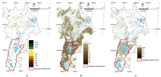 Erosion changes due to forest felling: (a) changes in erosion between 2007 and 2021 (t/ha/year); (b) changes after hypothetical case of total forest felling, compared to 2021 (t/ha/year); (c) changes in erosion few years after total forest felling, compared to 2021 (t/ha/year).