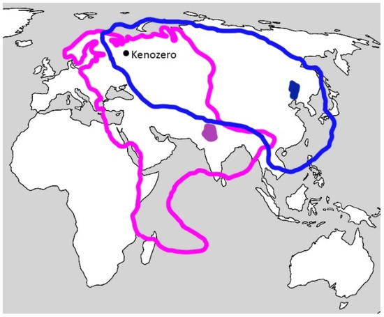 An example of two precipitation sheds which the Kenozero watershed belongs: light and dark purple colors show the boundary of the precipitation shed and the sink region in Pakistan and light and dark blue colors show the boundary of the precipitation shed and the sink region in China (after [71] with simplification).