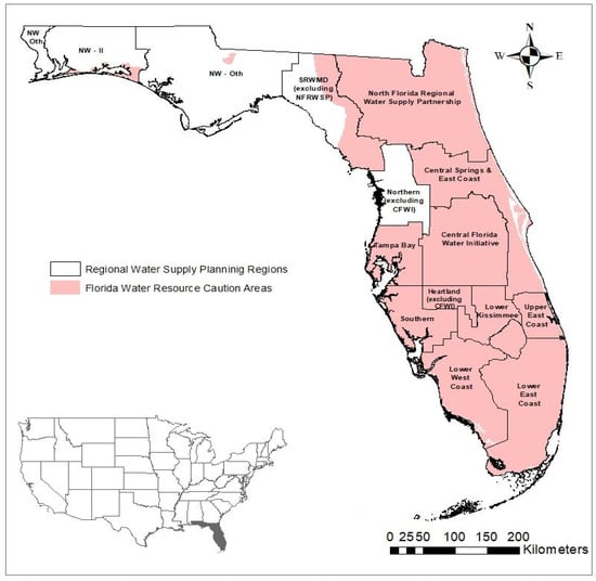 - DEP. Florida’s Water Resource Caution Areas. Available online: https://floridadep.gov/water/water/media/house-graphic-map-water-resource-caution-areas (accessed on 10 February 2022).