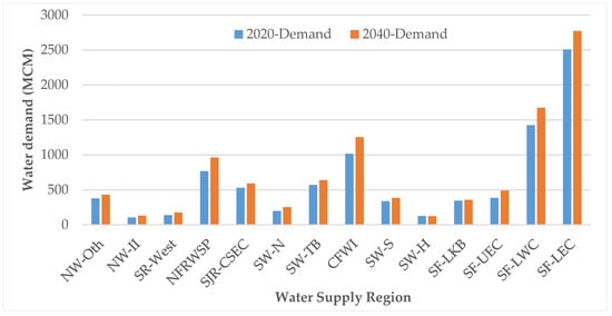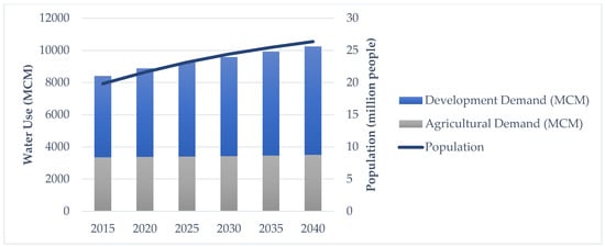 Figure 3 shows the summary of the statewide water demand forecasts. The result is quite revealing in several ways. First, there is an expected 15.9% increase in total water use during 2020–2040, but the most substantial increase in the statewide water demand is projected from the development of water demand (which includes residential water demand). Agricultural water demand is expected to stabilize in the next 20 years while the development water demand is projected to increase by more than 22%, from 5493 MCM in 2020 to 6725 MCM in 2040. Second, the projected increase in water demand is highly correlated with population growth, indicating that urbanization is the main driver of the projected increase in water use. Third, despite the expected strong urbanization and population growth, the agricultural water demand is projected with only a slight increase, indicating that few changes can be expected to irrigated acres or irrigation rates within the state [,] despite an expectedly strong population growth [] and thus food demand.