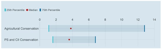 Figure 6 illustrates the range of capital costs of AG, PS, and CII water conservation projects. In general, agricultural water conservation projects have similar median costs compared to PS and CII water conservation projects. However, the range of cost for agricultural water conservation projects is much larger than that of PS and CII water conservation projects, suggesting that this cost depends on project type and size, design, and location. In general, water efficiency measure projects likely have a lower cost compared, for example, to commonly used reclaimed water projects, but these projects likely cost more than other alternative water supply project types (Figure 5). While water conservation programs considered by the WMDs also require investments, many PS and CII water conservation projects are likely to be less expensive than reclaimed water supply projects in many water supply planning regions. Thus, increasing the adoption rate of urban water conservation would be a more efficient approach to meet the water demand in the regions where the costs of alternative water supply projects such as reclaimed water are high.