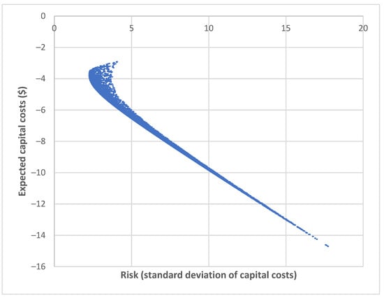 In this paper, we minimize the variance of the capital costs given various levels of the costs to build an efficient frontier. We construct an efficient frontier to demonstrate how MPT can be used to find a mix of water supply alternatives with the lowest risk level given a return. Portfolios on the efficient frontier are optimal in both offering maximum expected return for a level of risk and minimal risk for a given level of return. It is ideal to build an efficient frontier using the total net return per unit of capacity for water supply projects. The total net returns of alternative water supply projects are highly speculative because the total benefits and costs of water supply projects are often unavailable [,,]. Herein, we use capital costs to make this efficient frontier with the assumption that the benefits per unit capacity are the same for any water supply project. This assumption makes the variance of the capital costs equal to the variance of the returns.